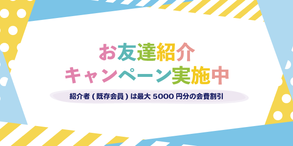 もし未入会のお友達をお誘いいただき新規入会された場合、紹介してくださった会員の方の翌々月会費を割引します。